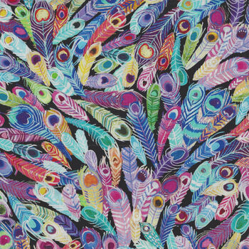 Peacock Serenade by P&B Textiles small multi coloured peacock feathers approx.1" on black.