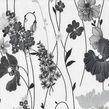 Midnight Pearl For Kanvas Fabrics on white with black and grey flowers softly etched in silver! Stunning.